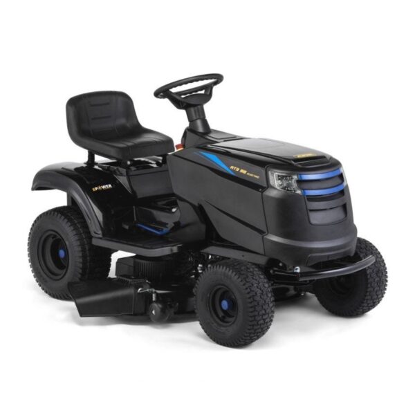 Een 48V Li-ion accu aangedreven elektrische tuintrekker met zijontlading en een maaibreedte van 98cm. Ideaal voor percelen van ongeveer 3500 m².
